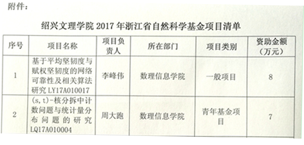 日前,浙江省自然科学基金委员会办公室公布了2017年省自然科学基金项目,黑白直播app 获批2项,一般项目和青年基金项目各1项。
