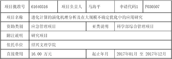 日前,国家自然科学基金委信息科学部公布了2016年应急管理项目,由黑白直播app 马海平副教授主持申请的项目《进化计算的演化机理分析及在大规模不确定优化中的应用研究》获准立项(项目编号:61640316),资助经费16万元。