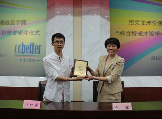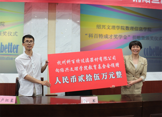 接受杭州科百特过滤器材有限公司捐赠,并向卢红星先生颁发捐赠证书、赠送捐赠铭牌。