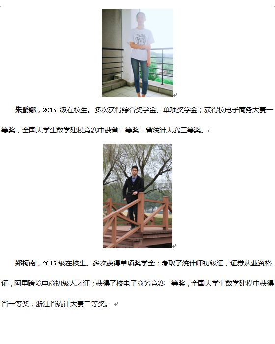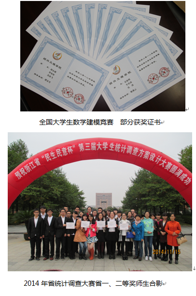 近年来,本专业教师在指导学生参加学科竞赛方面,取得了丰硕的成果。全国大学生数学建模竞赛中共获得省级及以上奖项100多项,其中国家级10多项。浙江省大学生统计调查大赛中共获得省级奖项40多项,其中省一等奖6项。特别是在2017年省统计调查大赛中,我校共获得省一、二、三等奖各1项、8项、1项,成绩位于全省高校前列。电子商务竞赛共获得省级及以上奖项15项,其中国家级1项。