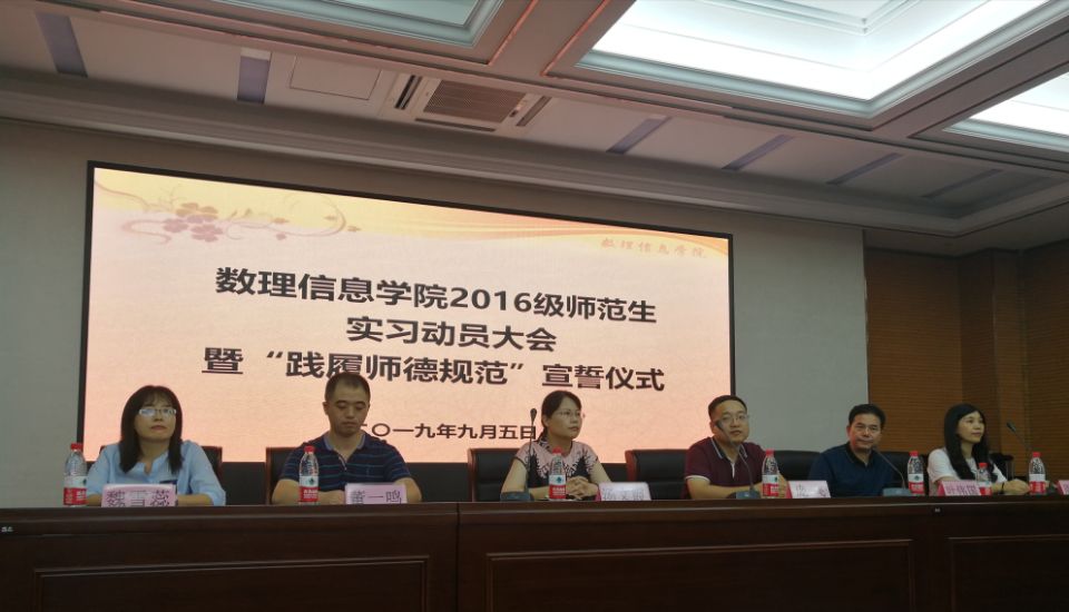 党委副书记庞飞、师范生实习负责人、物理系与数学系教师代表、各实习指导老师以及2016级全体师范生出席。大会由数学与应用数学(师范)173班王诗雯同学主持。