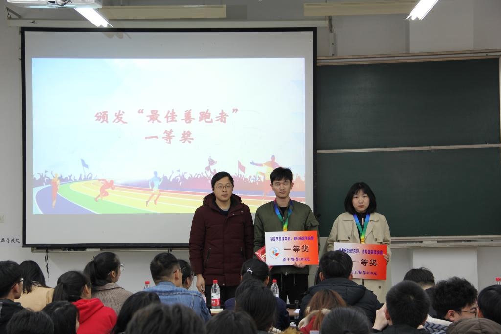 分团委书记潘丽华老师宣读获奖名单,对在跑团活动中表现突出的佼佼者予以表彰奖励,并赋予他们“最佳善跑者”的称号。男生排名第一的同学打卡52次,累计奔跑里程数高达124.93公里,女生排名第一的同学打卡51次,累计奔跑里程数高达231.52公里!多名同学打卡次数超过30次,获奖同学不仅有来自黑白足球直播