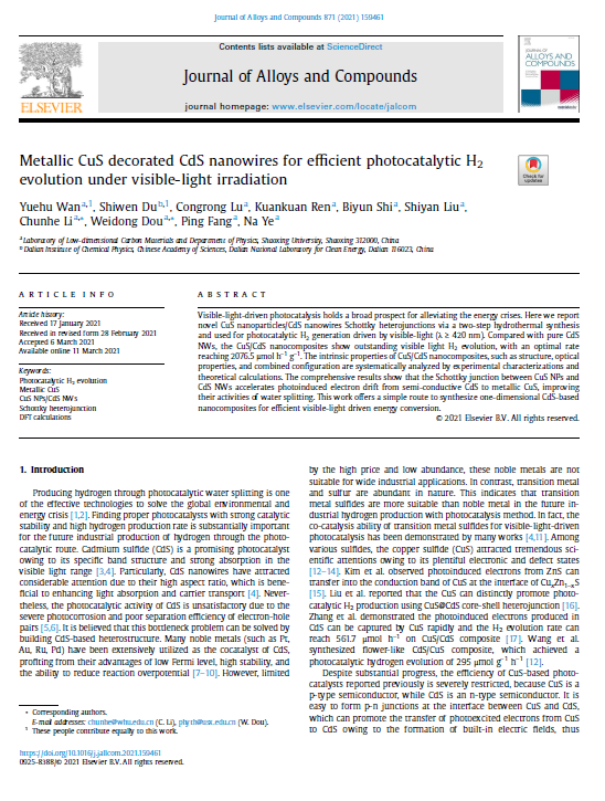 物理系物理学专业181班万跃虎同学以第一作者在《Journal of Alloys and Compounds》发表了题为“Metallic CuS decorated CdS nanowires for efficient photocatalytic H2evolution under visible-light irradiation”SCI学术论文。Journal of Alloys and Compounds是爱思唯尔旗下工程技术与材料科学领域的二区TOP期刊,影响因子为4.650。李春鹤博士和窦卫东教授为本文的共同通讯作者。