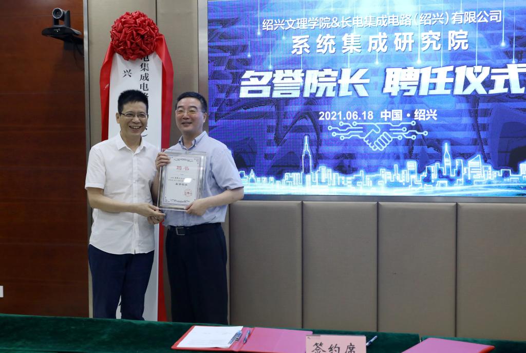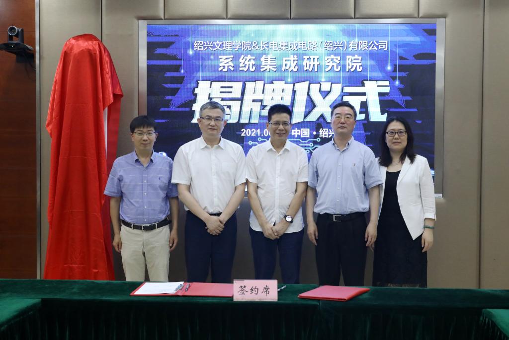 在铁城科教馆小会议室举行系统集成研究院成立仪式。校长王建力,中共绍兴市越城区委常委、滨海新区党工委委员、管委会副主任郑华,长电集成电路(绍兴)有限公司总经理梁新夫及企业代表、学校相关职能部门和黑白直播app