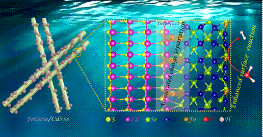 太阳能催化分解水到氢能的转化效率由光催化体系的光吸收效率、电荷分离效率与表面反应效率共同决定。负载助催化剂是提升电荷分离效率与表面反应效率的有效策略之一。然而,当前对助催化剂的研究开发主要是集中考察复合光催化剂的表观产氢性能,并未深入研究助催化剂的负载对界面电荷分离效率和表面催化反应速率的影响及规律。本工作首先通过理论计算发现掺杂外来过渡金属元素(TM, TM = Mn, Fe, Ni, Cu)对CoSe和CoSe/CdSSe肖特基异质结的电子结构会产生不同的影响,并预测这会对CoSe/CdSSe异质结光催化性能产生不同作用。其中,当掺杂Fe元素时,得益于FeCoSe诱导的较大的异质结界面电势降(ΔV)和减小的氢吸附吉布斯自由能(ΔGH*),使其可以有效地加速异质结中电子-空穴对的分离并提高表面析氢效率,从而增强光催化效率。基于计算结果与分析,我们合成了具有0D/1D结构的TMCoSe/CdSSe纳米复合材料,其中FeCoSe/CdSSe具有最优异的光催化析氢性能(513.76 μmol h-1),分别是纯CdSSe和CoSe/CdSSe的36.6倍和2.0倍。此外,载流子动力学研究表明FeCoSe/CdSSe具有最快速的电荷分离效率和迁移率。
