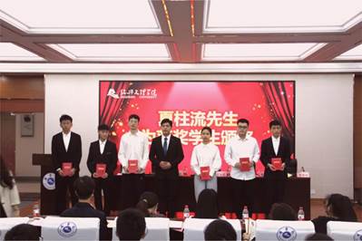 )获得者的决定》。接下来,嘉兴心致医疗科技有限公司总经理夏柱流先生为第二届“心致奖学金”获得者廖海燕、刘传霖、毕徐府、吴青书、韦云霄、李金航等6位同学颁奖。同时,获奖学生代表刘传霖向夏柱流先生赠送纪念品以示感谢。