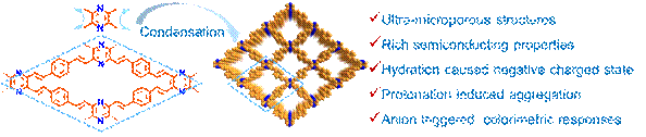 竺琳博士在开展博士后工作期间利用2,3,5,6-四甲基吡嗪为关键单体,在苯甲酸酐为催化剂的条件下与含二醛基的单体形成缩合反应,成功制备了一组含有碳碳双键连接的二维共价有机框架材料(COFs),两种COFs通过质子化/去质子化表现出可调节的聚集行为,并对不同pKa的阴离子表现出孔径依赖的比色响应。这项工作不仅为微孔COFs的合成提供了新的策略,而且为探索基于比色响应的阴离子特异性检测在生物、工业和环境过程中的应用做出了贡献。