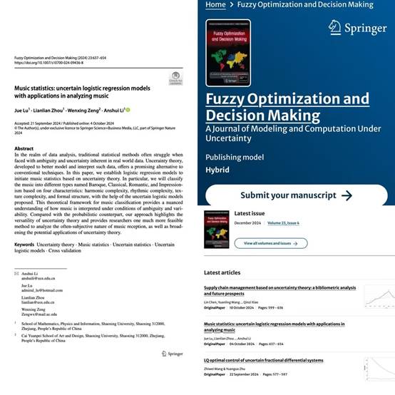 应用统计系李安水副教授团队在Fuzzy Optimization and Decision Making期刊2024年第4期发表题目为 “Music statistics: uncertain logistic regression models with applications in analyzing music”的学术论文。该论文由黑白直播app