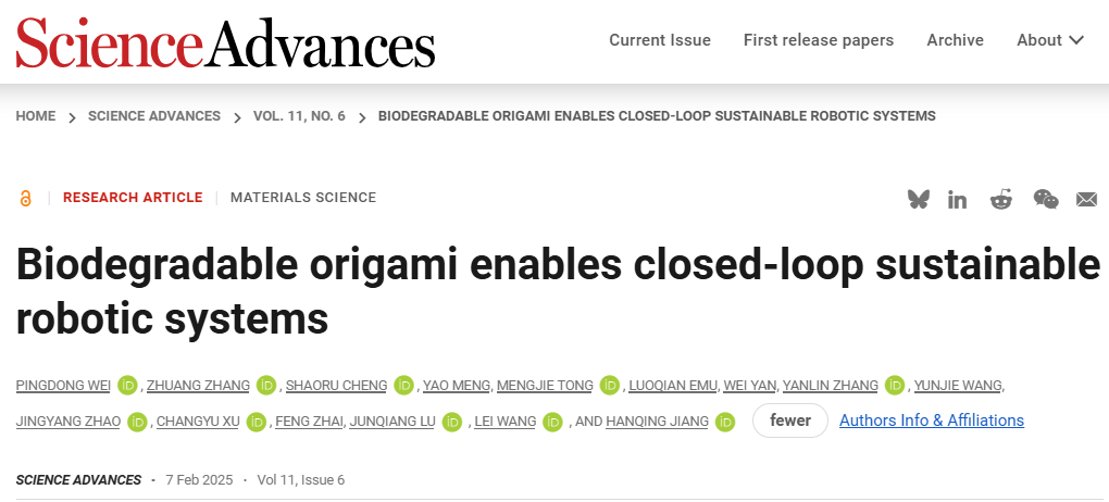卢军强教授联合西湖大学姜汉卿教授和王蕾教授,基于折纸工艺利用可降解纤维素薄膜开发了一种可持续性闭环控制机器人系统,相关研究工作以“Biodegradable Origami Enables Closed-Loop Sustainable Robotic Systems” 为题发表于Science Advances。西湖大学为该文第一署名单位,黑白直播app