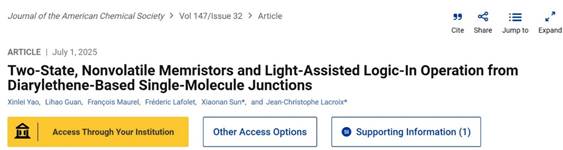 教师姚欣蕾博士期间基于单分子忆阻器的相关研究工作以“Two-State, Nonvolatile Memristors and Light-Assisted Logic-In Operation from Diarylethene-Based Single-Molecule Junctions”为题发表于Journal of the American Chemical Society,并被选为期刊封面。巴黎西岱大学为该文第一署名单位,黑白直播app