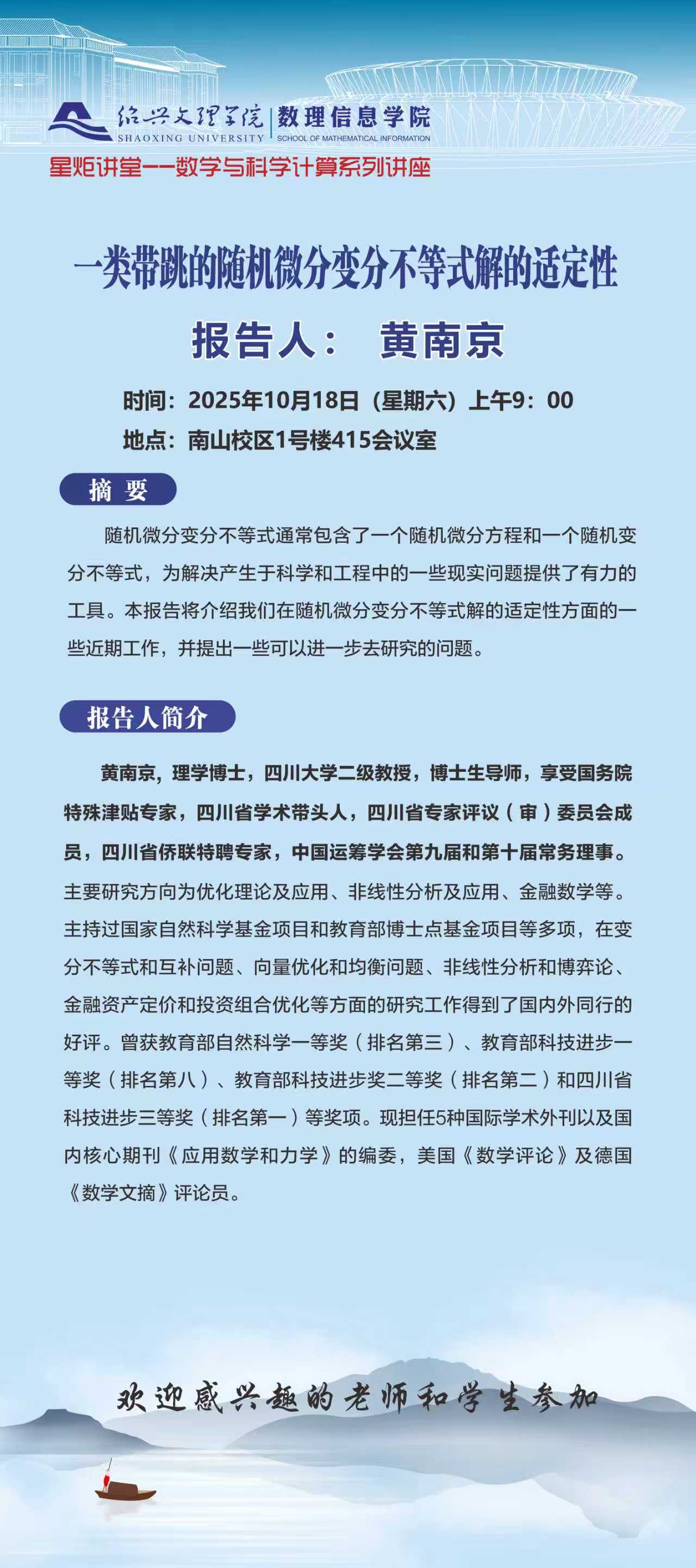 四川大学 黄南京教授:一类带跳的随机微分变分不等式解的适定性: