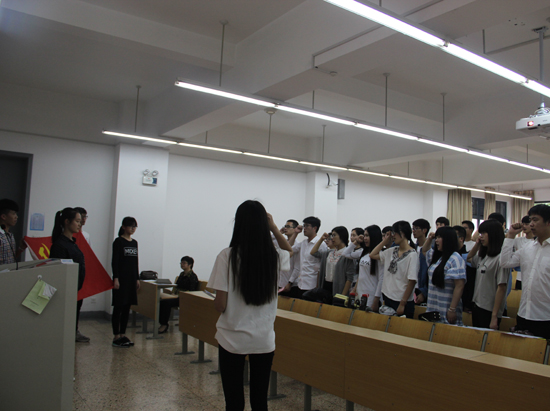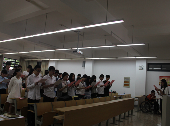 大会在庄严的国际歌声中开始。全体毕业生党员起立,在微电子121班党员伍玲玲同志带领下,重温入党誓词,面向党旗庄严宣誓。面对母校四年培育之恩,全体毕业生党员同时作出郑重承诺:“在离校期间团结带领全体毕业生严格遵守学校有关规定,维护学校的正常秩序,积极配合学校做好毕业生离校工作,作文明离校的表率。毕业后继续以一名党员的标准要求自己,切实发挥党员的先锋模范作用,不辜负党组织的培养和期望,为学校争光。”