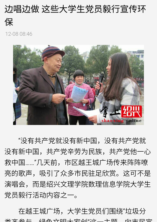 大学生党员组织开展了“传承红色精神 助力绿色发展”主题毅行活动,并将绿色发展志愿活动和重温入党誓词、缅怀革命先烈等活动贯穿于毅行过程中,身体力行传递绿色发展理念。活动受到绍兴日报、天天商报以及绍兴日报社官方APP“掌上绍兴”等媒体的关注报道。
