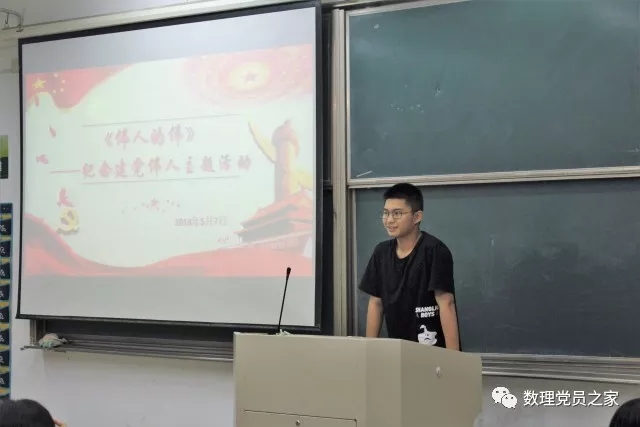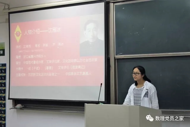 紧接着每位发展对象都上台分享了自己心目中的建党伟人,首先是来自数学151和数学152的冯佳燕、金鑫女为大家分享了两位来自她们家乡的建党伟人———沈雁冰(茅盾)、俞秀松。
