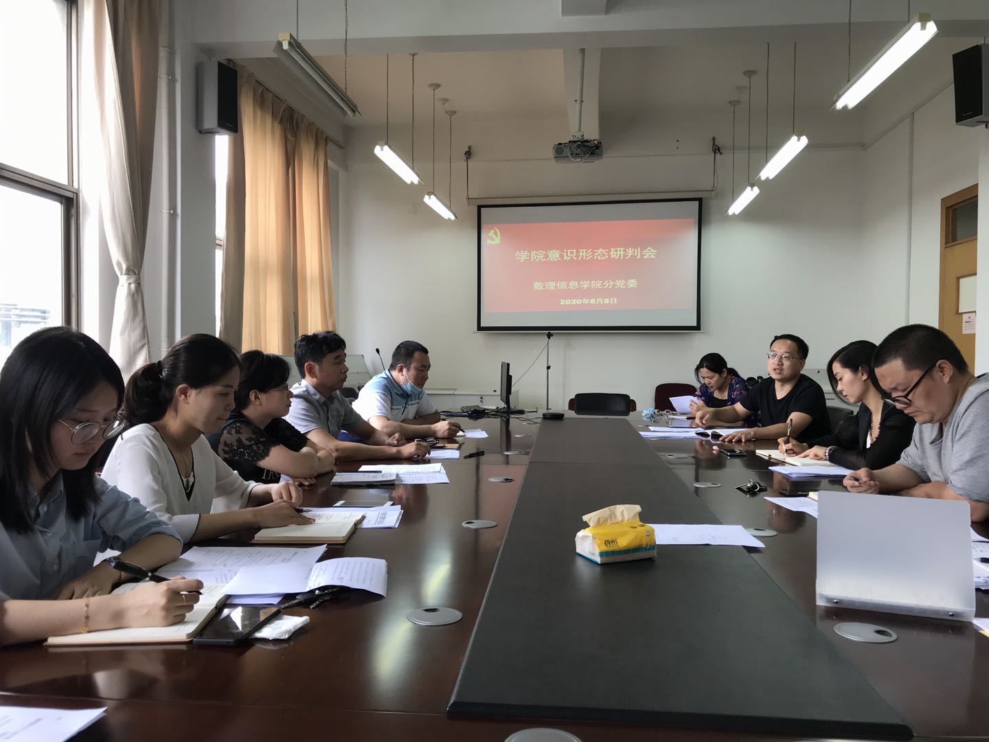 党委在411会议室召开意识形态专题研判会,党委委员、党支部书记、科室负责人和辅导员出席本次会议。