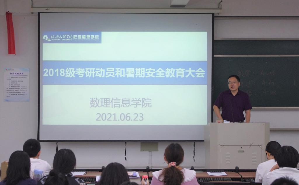 最后,各专业在分会场进行了考研动员和暑期安全教育。数学与应用数学(师范)专业考研导师组组长魏雪蕊老师强调每一个选择考研的同学都应该自己考虑清楚而不是三心二意,既然选择了考研就应该坚定目标,尽早着手复习。数学系系主任黄玲娣老师希望每一个考研学子都能平心静气,调整好自己的作息,拿出干劲,全力冲刺。数学系专业主任周凤燕老师分享了数学分析和高等代数等专业课的复习要领,并强调,既然选择考研,就要吃得起苦,不要轻言放弃。应用统计学专业考研导师组组长刘焕香老师对考研学子提出了几点要求:全体学生每天应按时到课复习,自己做好取舍与权衡,提前规划好计划,临考才能做到从容自信;在学习过程中不怕吃苦,但也要做好劳逸结合;定期做好沟通,保证学习效率的最大化。电子信息工程专业考研导师卢新祥老师表示考研是一次重要的人生节点,要想结果是“金榜题名”,那过程就必须是“背水一战”。他分析了近两年的考研形式,强调同学们应注重自己的加分项,在面试中扩大自身优势。最后,电子信息工程专业陈非予老师叮嘱同学们暑假期间注意安全,做到劳逸结合。