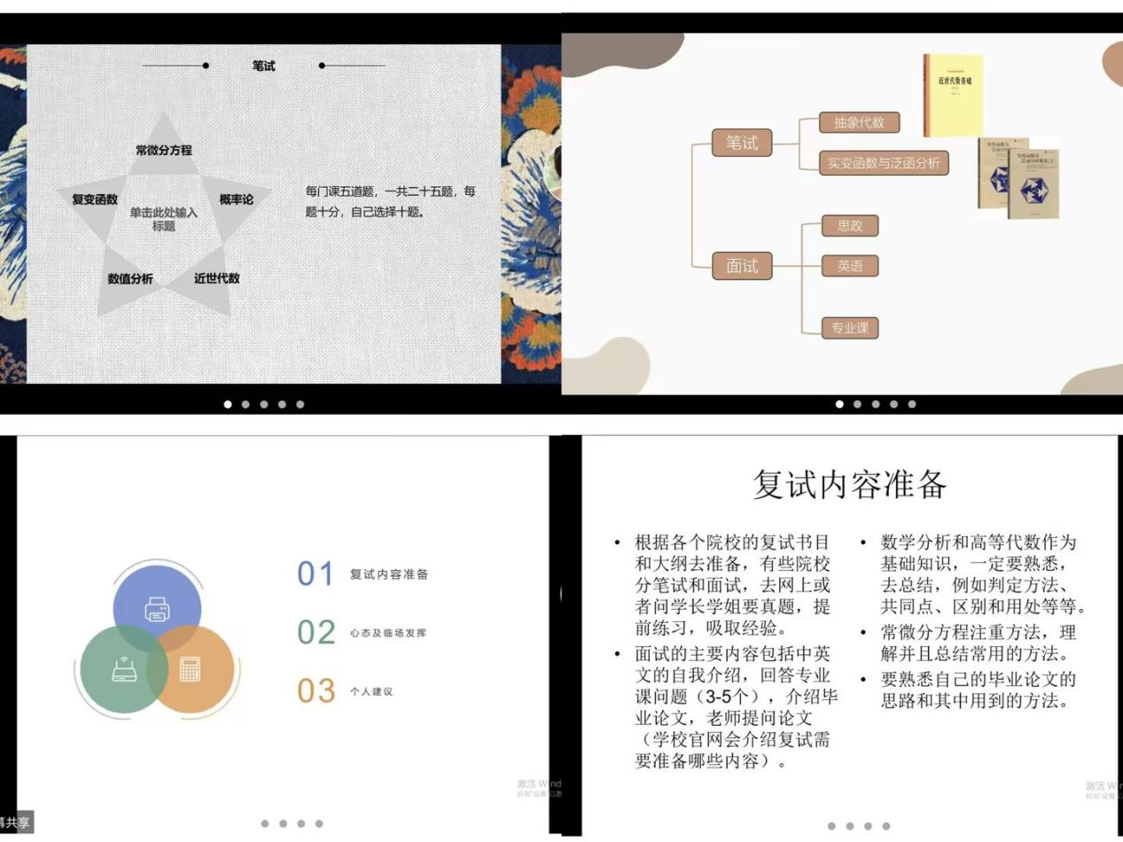 此后,原数学193班,现就读于东华大学应用数学专业的叶欣迪学姐也向大家分享了她的经验。在复试的内容上,学姐的建议非常详细,除了根据各个院校的复试书目和大纲之外,还从英语面试的自我介绍准备到要熟知自己毕业论文的常用方法等各个方面都给了大家实用的建议。在临场发挥时,心态亦是不可或缺,学姐告诉我们,在面试时,不要过于紧张,要自信、真诚地面对老师,不要纠结于自己的小问题等。