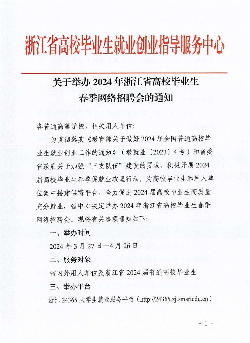 关于举办2024年浙江省高校毕业生 春季网络招聘会的通知