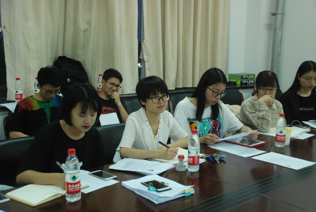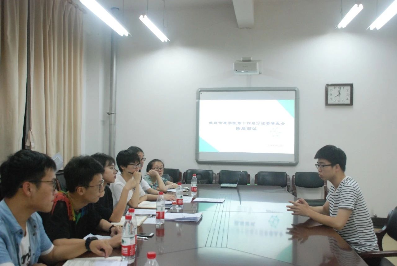 辅导员潘丽华老师做“主考官”,十四届主席团成员以及各部门部长均到场指导提出意见。