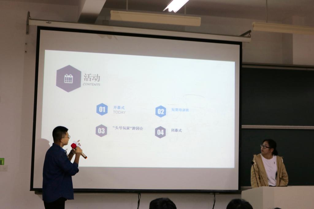 开幕式的第一环节是对本次科技文化节活动主要内容的概述。本次科技文化节分为四个部分:开幕式、短期培训班、“头号玩家”游园会、闭幕式。短期培训班分成四期开展,有兴趣的同学都可以报名参加。培训班的主要目的是提高学生的创新创意思维以及动手实践能力。“头号玩家”游园会以科技文化与游戏相结合的形式开展,让同学们在玩的同时感受科技的精彩。