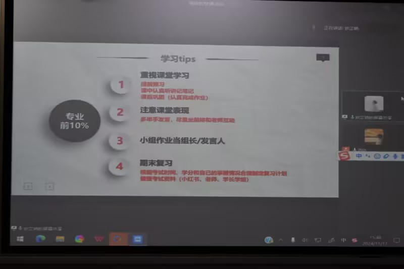 欧芷晴向同学们进行了国家奖学金的经验分享,着重强调了学习成绩在国家奖学金评选中的重要性。她提到学科竞赛获奖是评选国家奖学金的加分项,并告诉同学们有关学科竞赛的实用技巧。她送给同学们一句话,“努力的意义是当所有美好的事情奔我而来的时候,我能够坦然地张开双臂拥抱它,并且觉得我值得”,希望同学们能够迎接闪闪发光的自己。