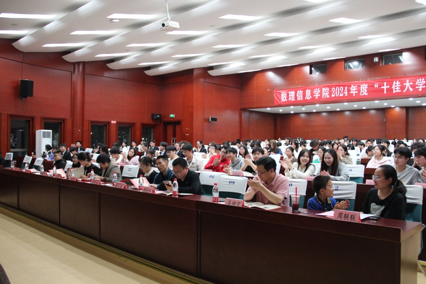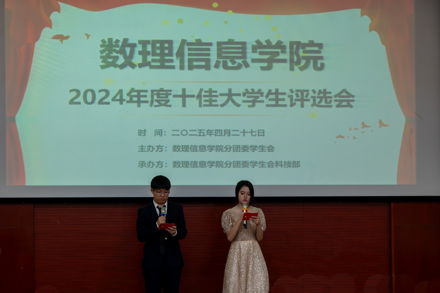 2024年度“十佳大学生”获得者分别为:数学与应用数学(师范)221班陈烨,数学与应用数学(师范)222班叶海涛,数学与应用数学(师范)223班翁雅凌,电子信息工程222班阳勇,科学教育(师范2)221班林玲,微电子科学与工程222班丁悦,物理学(师范)231班罗爽语,物理学(师范)232班桂如冰,数学与应用数学(师范)232班杨晓丹,光电信息科学与工程232班齐航。在观众的一片热烈掌声中,杜美霞老师为以上获奖的同学进行了颁奖。