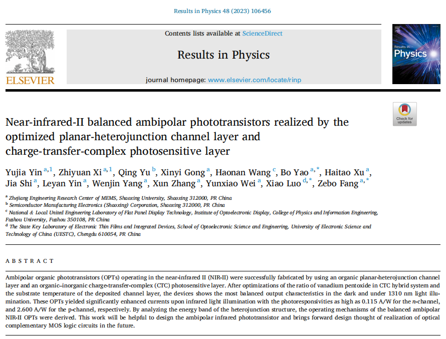 微电子科学与工程专业191班尹宇嘉、希治远以共同一作在《Results in Physics》上发表题为《Near-infrared-II balanced ambipolar phototransistors realized by the optimized planar-heterojunction channel layer and charge-transfer-complex photosensitive layer》(Results in Physics, 48, 106456, 2023)的研究论文。《Results in Physics》是物理学、材料科学和应用物理学等学科领域的著名期刊,该杂志2011-2022年度影响因子为4.565,属中科院物理与天体物理大类二区。黑白直播app